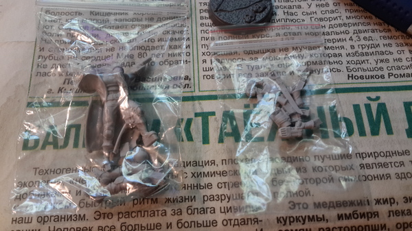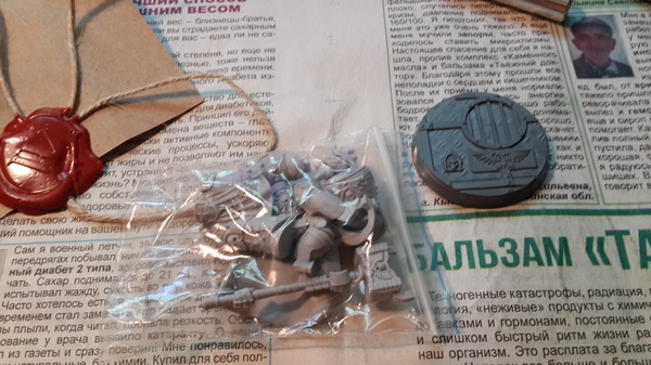 Внутри коробочки уместились все три миниатюры, которые я заказал. Всё это чудо было завёрнуто в пупырчатую плёнку, а каждая фигурка цивильно расфасована по пакетикам. К каждой модели идёт подставка, причём довольно хорошая (видать Sector Imperialis), а не просто гладкая фишка.