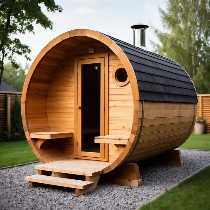 Выше Алиса сгенерила мне картинку, которая в целом хорошо отображает конструктив бани-бочки. Это цилиндр из доски, крытый гибкой кровлей через вентзазор. С печкой внутри и дверью наружу. Стянутый обручами вокруг двух или более перегородок. В целом, немного материала, не очень толковая, быстро теряющая тепло и не особо долговечная конструкция. Но почему тогда она такая дорогая?