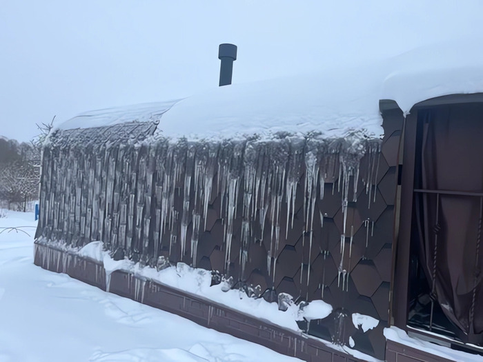 Ещё из минусов могу отметить, что крыши на таких банях лепят, в большинстве случаев, с нарушениями технологии. Набивают бруски вдоль бочки (так проще, ибо чтобы набить их поперёк, надо делать их радиусными, а это гемор) и пришивают к ним OSB, на которую лепят Шинглас. А потом мы видим вот такую обсосуленность.
