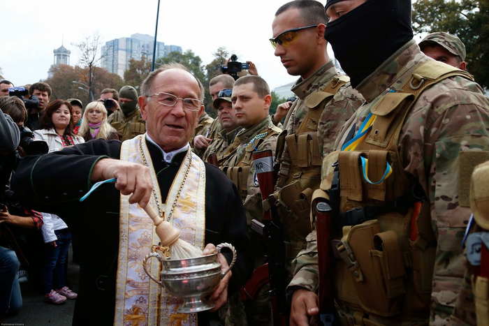 Сегодня Любомир Гузар «от имени Богородицы» благословляет проведение «антитеррористической операции». А униатский капеллан Андрей Зелинский, «окормлявший» батальоны карателей-неонацистов «на передовой под Славянском», заявляет, что обстрелы мирного населения на Донбассе – это «рождение эпоса для истории новой Украины». Из рядов униатов и филаретовцев рекрутируются капелланы в подразделения вооруженных сил Украины и батальоны «нацгвардии». Они же дают благословление карателям на продолжение войны против собственного народа.