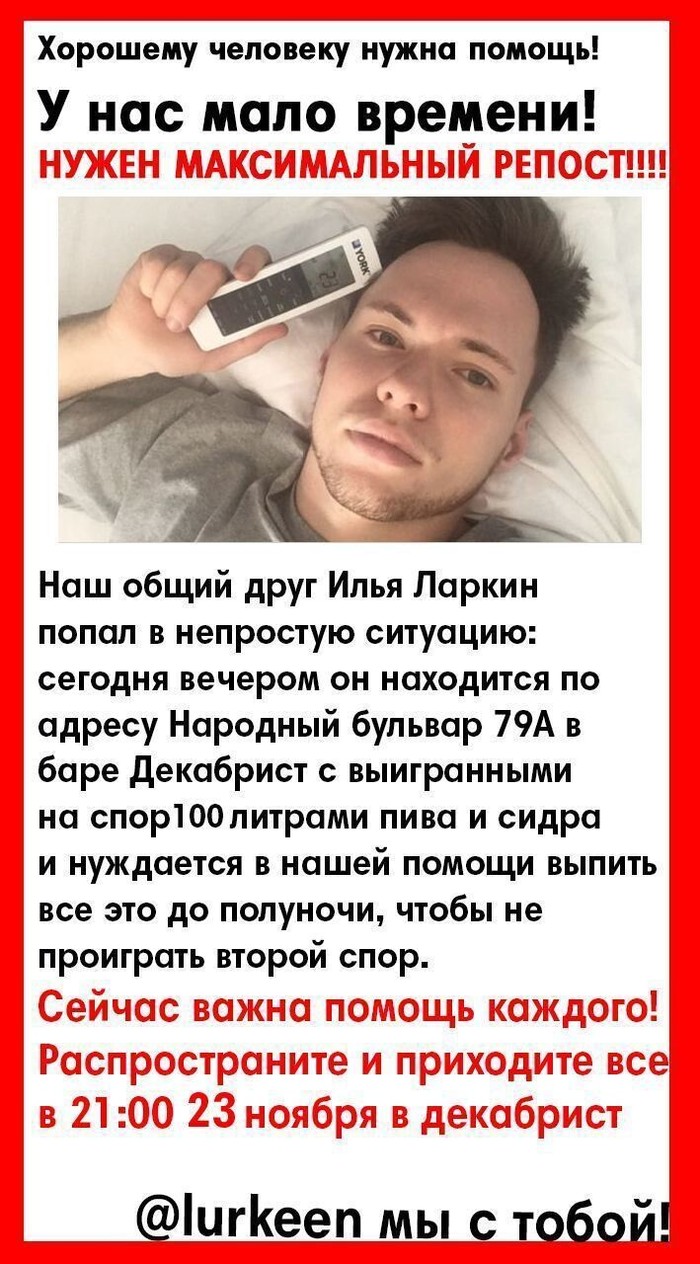 Текст я собрал такой, чтобы беглый взгляд поначалу не заметил подставы, поэтому "Наш общий друг Илья Ларкин попал в непростую ситуацию" — классика жанра, так пишутся наверное все прелюдии в подобных картинках. Дальше "он находится по адресу" — все также привычное клише для этого формата, здесь обычно пишется что-то про больницу, адрес например. И когда уже половина моих знакомых перепугались думая, что со мной что-то случилось, наступает развязка и каждый понимает, в чем тут, собственно и было дело. И даже здесь человек получает абсолютно новые эмоции, которые не способны извлечь абсолютное большинство афиш тусовок или концертов.