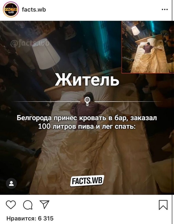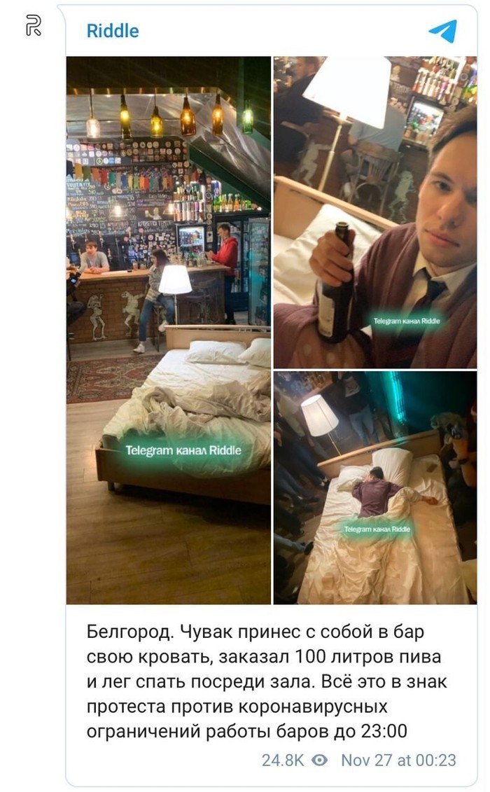 Из интересных людей, например, пост с кроваткой репостнул к себе в канал ресторатор Дмитрий Левицкий(владелец компании Hurma Management Group и автор баров «Дорогая, я перезвоню…» и «Куклы пистолеты»)