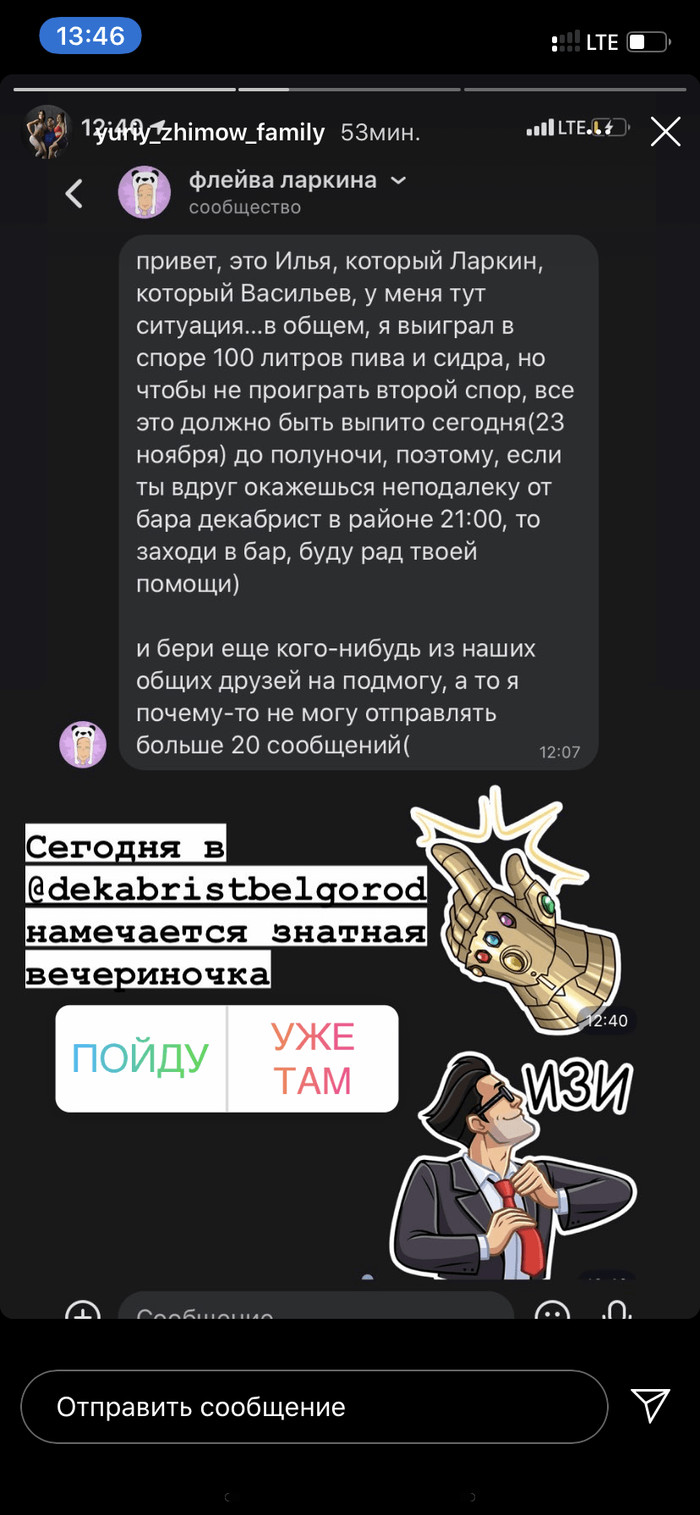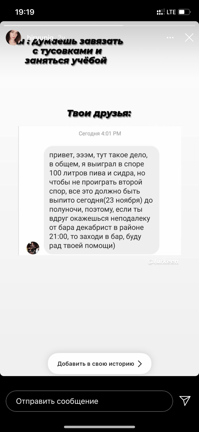 Хотя изначально я и отправлял сообщение только людям, которые сами по себе общительные и легкие на подъем и тем, у кого на месте вероятно окажется много знакомых(из собственного опыта я узнал, что без наличия одного из этих двух параметров пришедшему человеку сложнее будет найти себе с кем покоммуницировать, сколько бы литров пива не было), но потом прикинул, что это бар, а не у меня дома, поэтому я могу позволить себе здесь снять с себя эту ношу ответственности и позвать как можно больше всех, чтобы наверняка наполнить пространство людьми и чтобы у каждого из пришедших был максимальный выбор возможностей для общения, все-таки, некоторые космонавты с моей орбиты знакомы с друг другом, да и город в целом небольшой, поэтому если из 100 человек найдется хотя бы 2-3% знакомых, то это уже есть с кем проболтать весь вечер, тем более, что универсальная тема для разговора уже существует и она одна на всех — "что здесь вообще происходит?" А тем временем я штамповал уже вторую сотню сообщений и инфа о грядущем событии уже начала просачиваться в сторис у ребят: