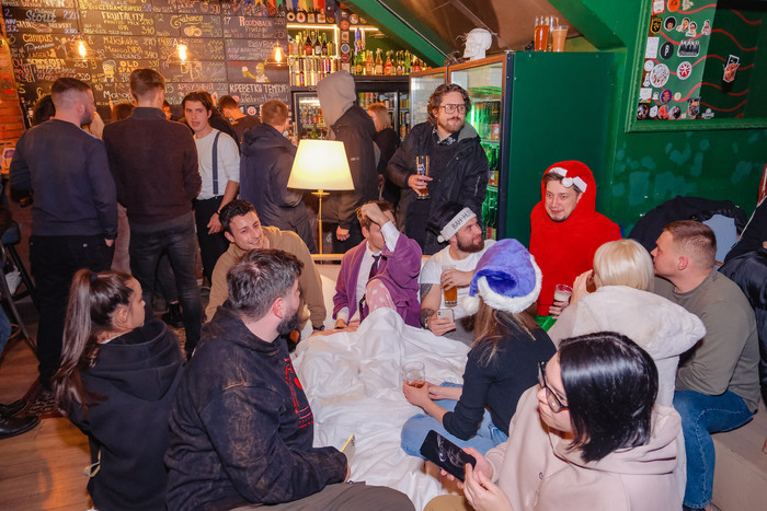 Саму кровать получилось поставить так, что она была видна прямо с порога бара и каждый открывающий дверь резко погружался в атмосферу домашнего уюта, из колонок доносились рождественские песни, а в остальной части помещения свет был слегка приглушен. Лежа в постели еще минут 15 можно было наблюдать, как неожиданно меняются лица зашедших, пока бар не заполнился полностью.