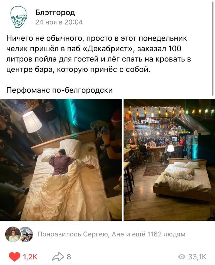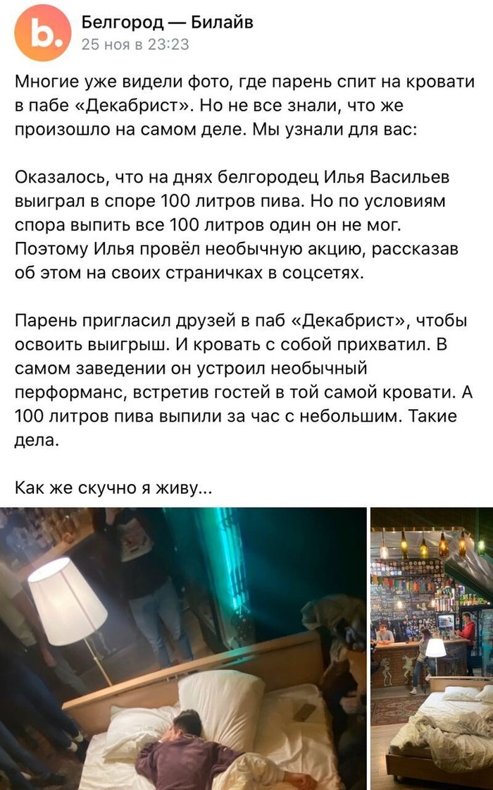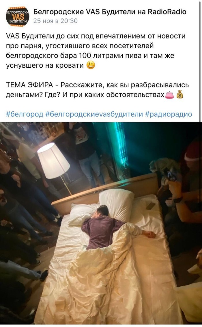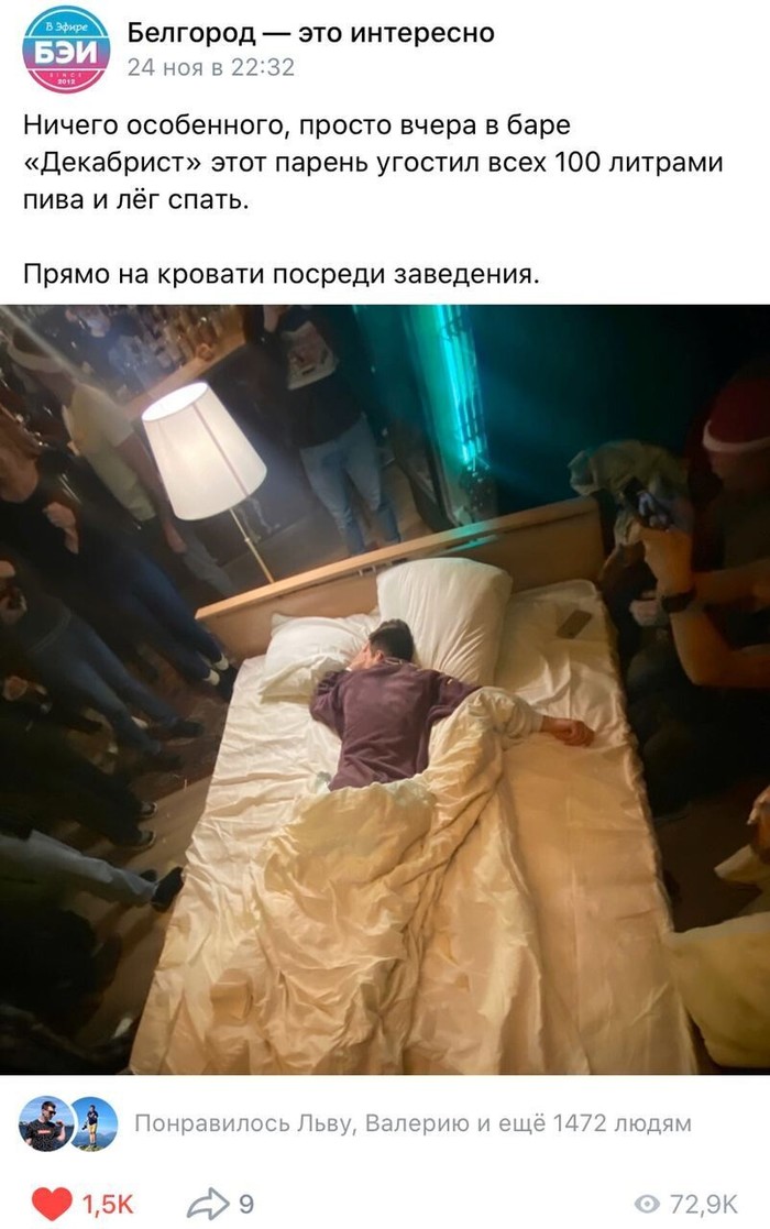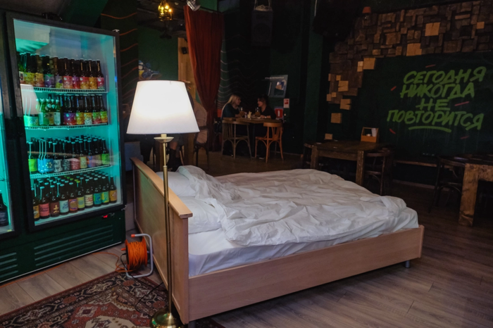 Житель Белгорода принес кровать в бар, заказал 100 литров пива и лег спать