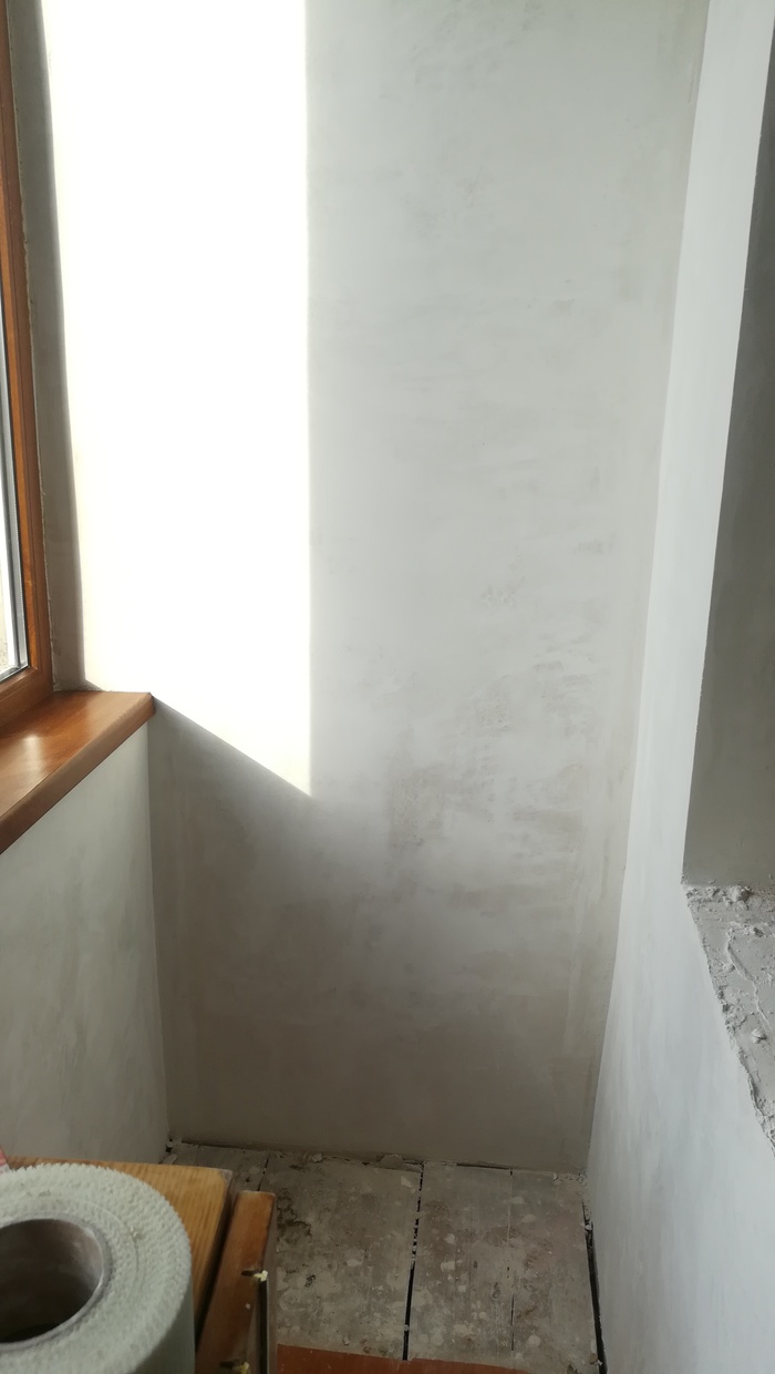 Затеяли сделать мелкий ремонт на балконе после замены окон. Один из балконов решили Отштукатурить и покрасить. Штукатурил Сам без выравнивания стен. Стены до этого были заштукатурены и покрыты фасадной краской. Кирпичная кладка неровная и стены сильно завалены да и бугров с ямами хватает. Если выравнивать то до 6-7 см в некоторых местах нужно накидывать. Решил просто выровнять под шпатель 40см. И немного углы наружные визуально вытащить.