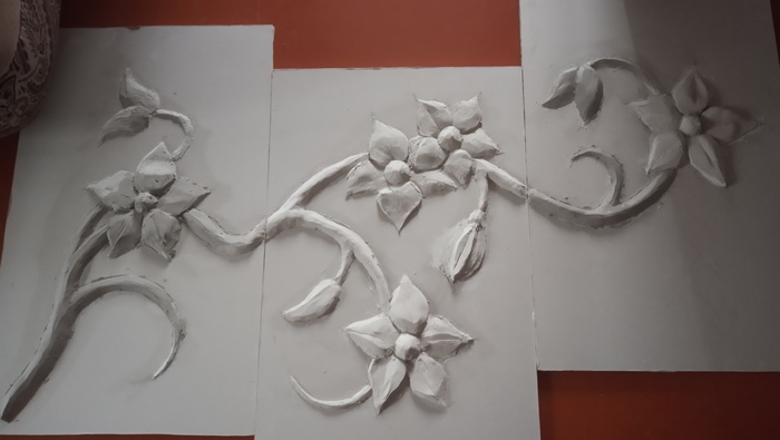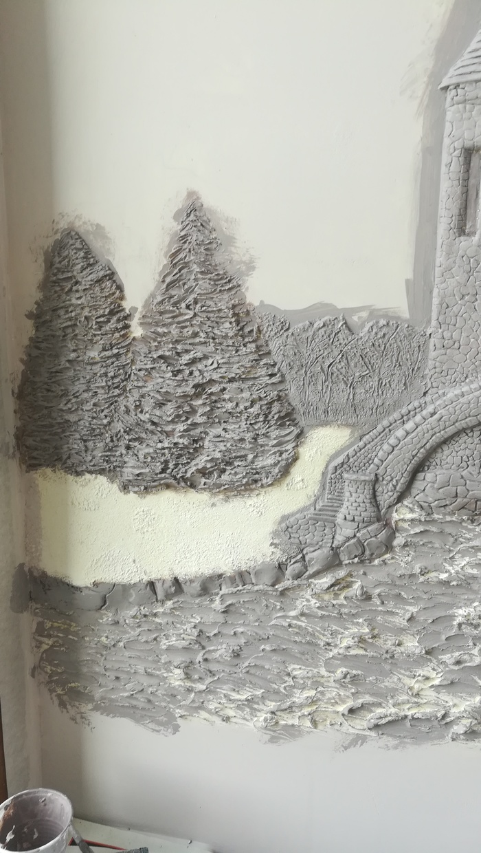 Пробовал несколько Вариантов нанесения барельефа. Особенно намучился с тем что первые слои были из штукатурки, а последующие из шпаклевки, при прорезании мелких деталей. Штукатурка была более крепче, а Шпаклевка имело свойство крошиться, и часто финишные слои шпаклевки отлетали от предыдущего слоя.