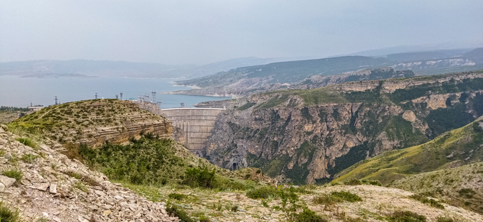 Сулакская ГЭС. Вид уже со стороны Сулакского каньона. Оставил машину у дороги и пошел в сторону каньона. Недалеко стоял какой-то дом. Еще тонкая труба почему то лила воду просто тупо на землю. Зачем - непонятно? Вода не по счётчику? Огородов рядом не увидел.