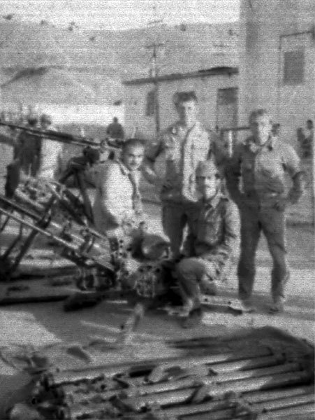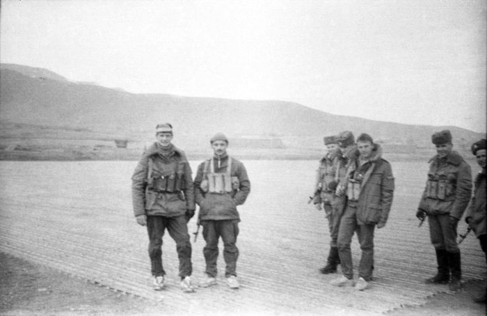 Осень (октябрь-ноябрь) 1987г.Вертолетная площадка около кишлака Вуни-Суфла (баракинская). Досмотровая группа 421 сборная 'солянка' прилетела с облета.Встречал досмотровую группу л-т Евгений Барышев (в центре) прибыв на БТР-70.