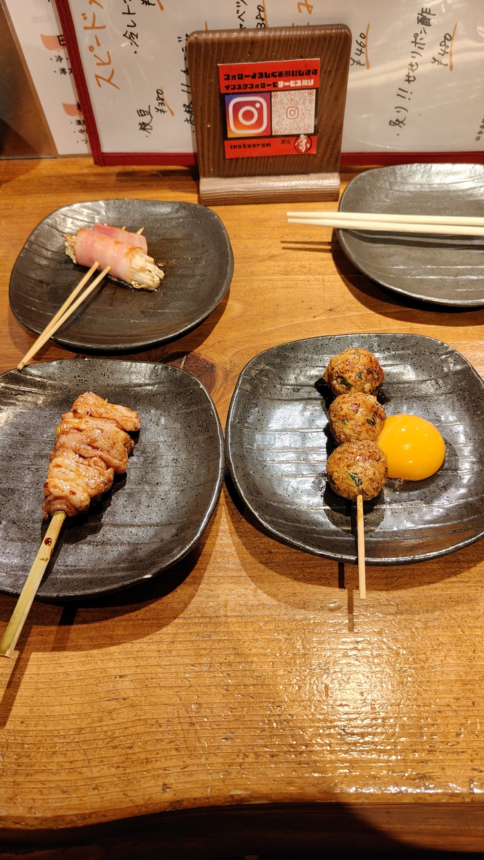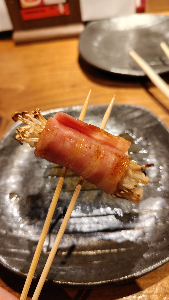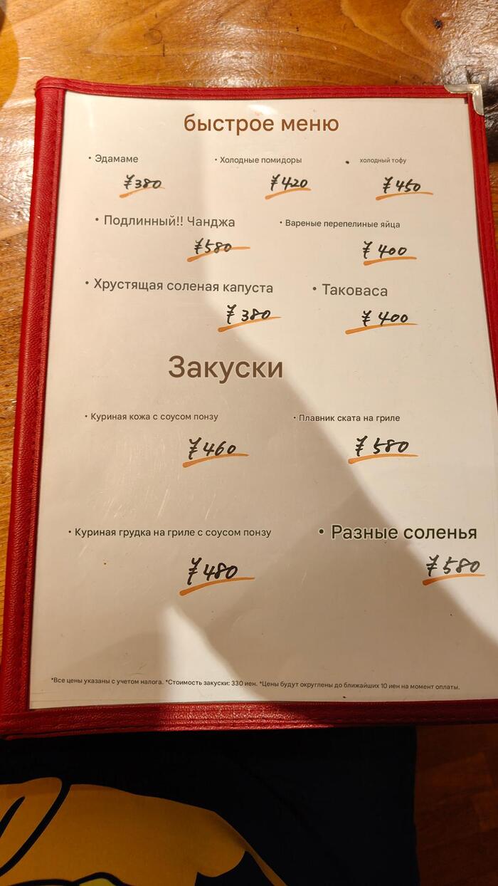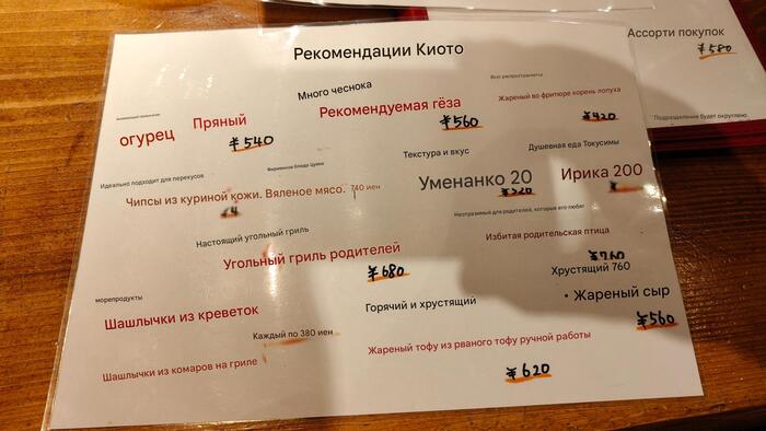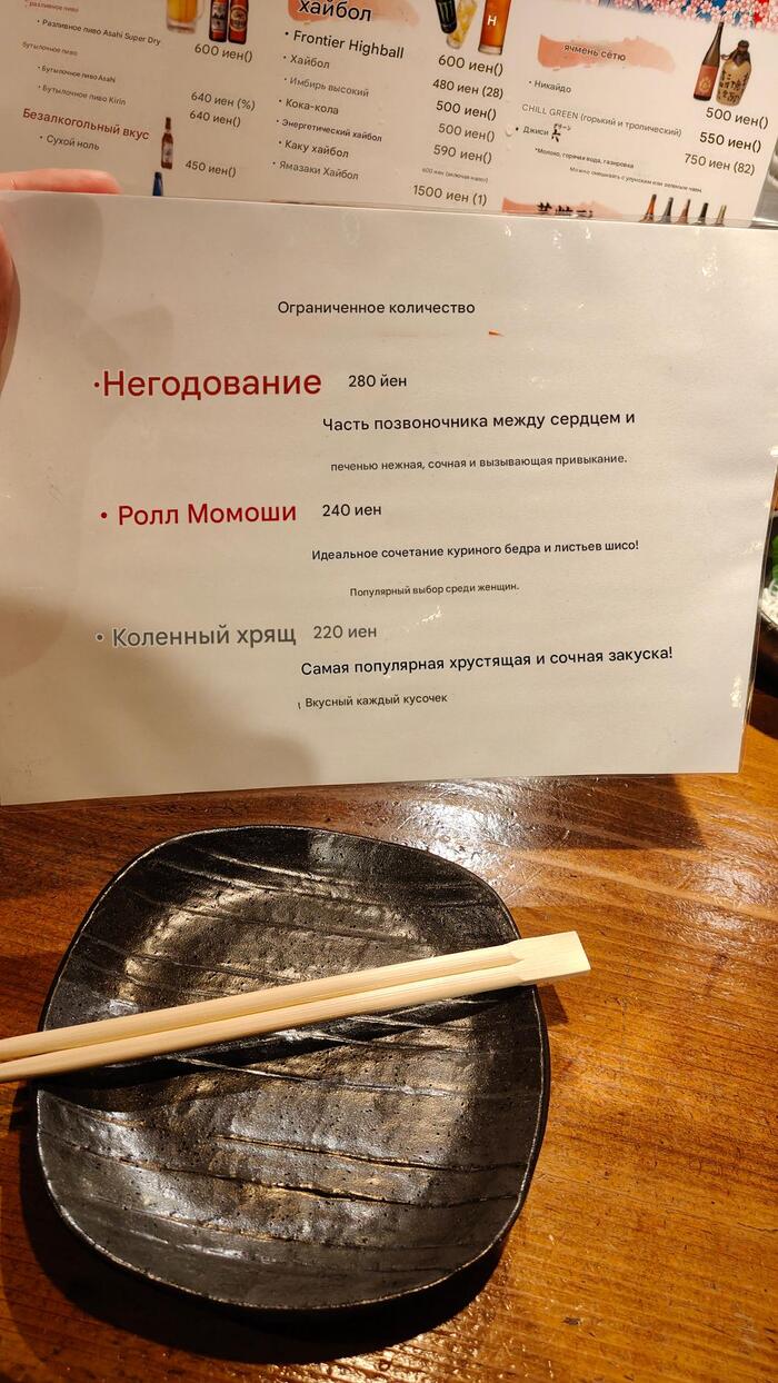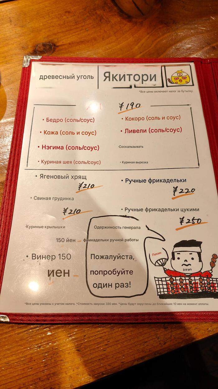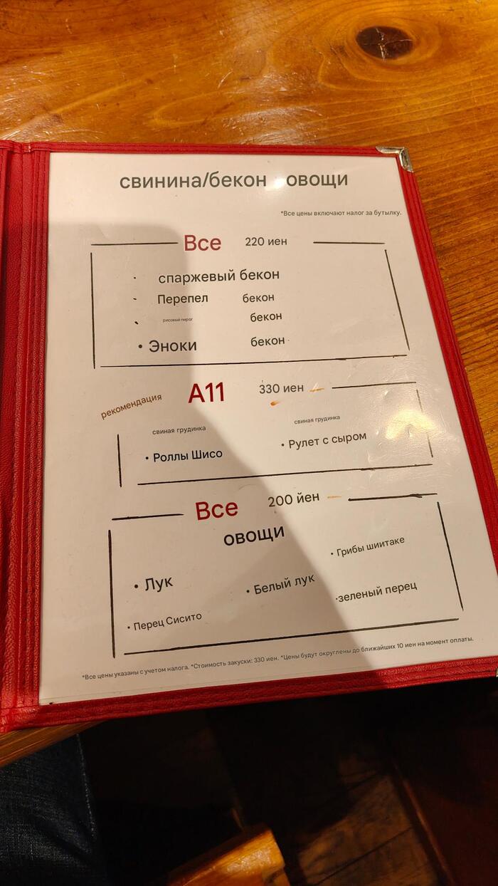 С этим сложности...местечко для местных...всё через переводчик.Шашлычки: Фрикадельки знаем- 130р (похоже фирменное), Эноки бекон тоже знаем-120р. Всё таки идзакая специализируется на шашлычках...