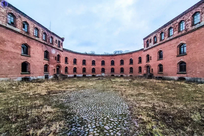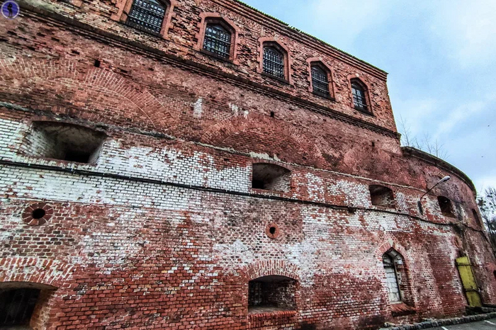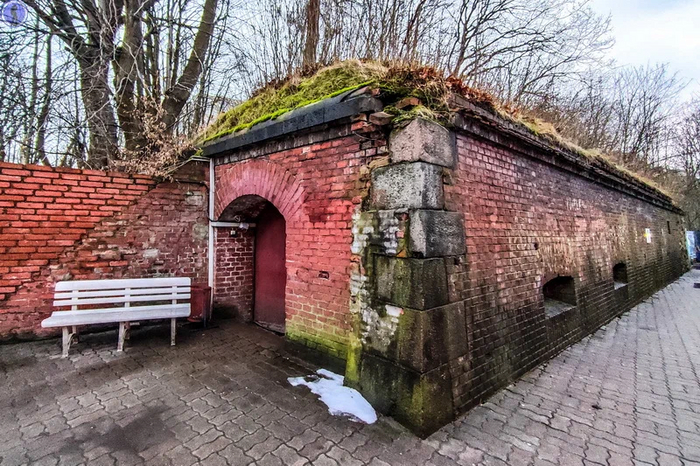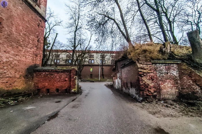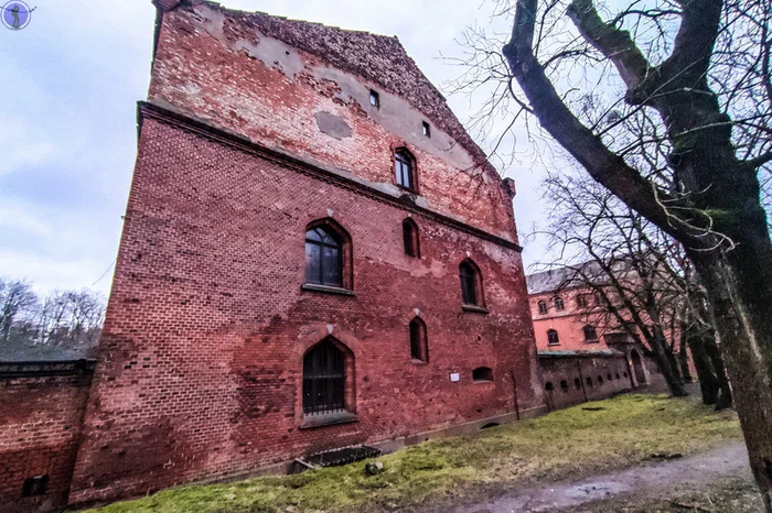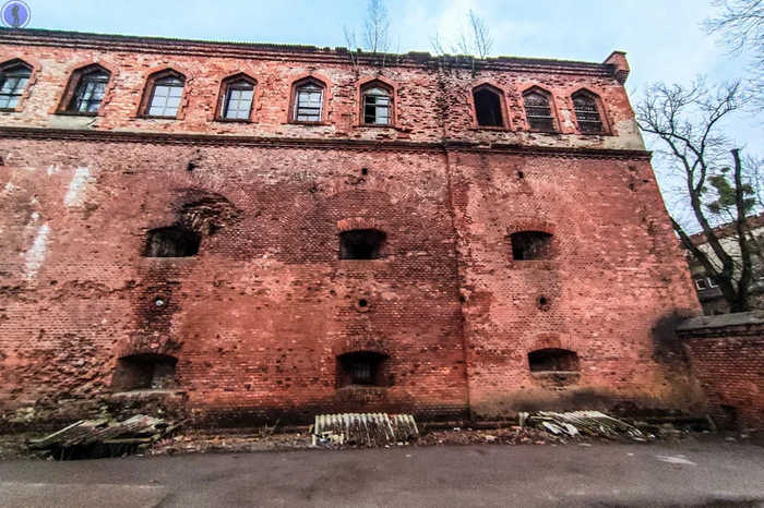 А через дорогу расположена бывшая оборонительная казарма Кронпринц, строившаяся ещё в период с 1843 по 1849 гг. и входившая в систему второго вального оборонительного обвода Кёнигсберга.