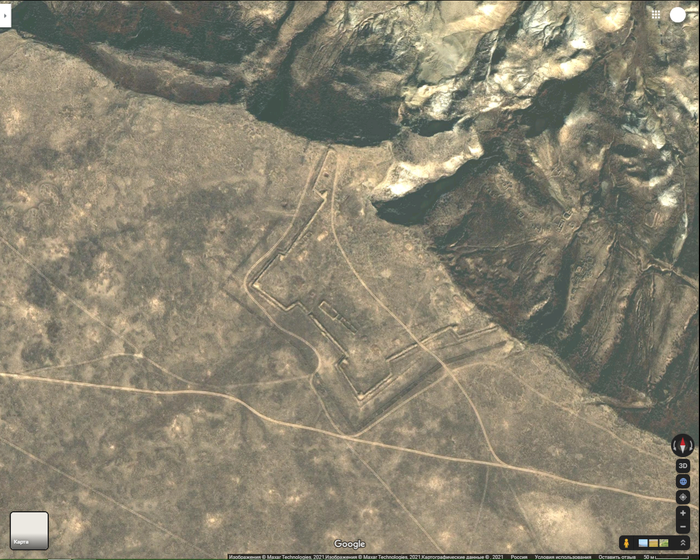 У меня не возникло бы вопросов насчёт этой крепости, мало ли какие укрепления были построены во время Российской империи, если бы не одно "НО", как видно на скрине с гуголовских карт, северовосточная часть этой предположительно бастионной крепости была накрыта либо селевым потоком, либо прорабы-молдаване (ничего не имею против молдаван, прекрасный народ) не там начали строить.