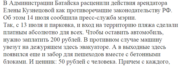взимание платы за проход на территорию пляжа озера Соленое г. Батайска