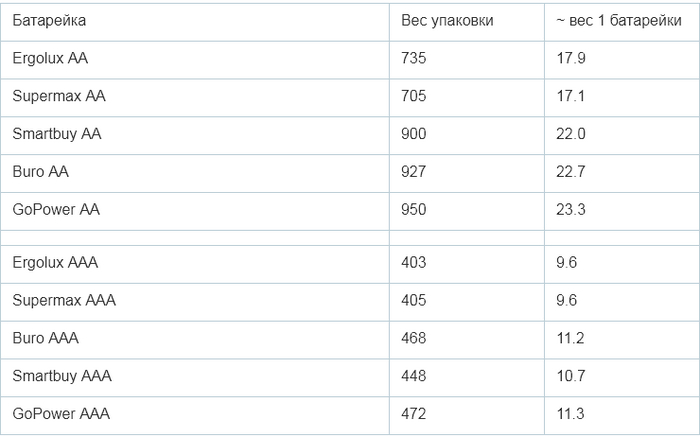 Первое, что я сделал, получив батарейки — взвесил их прямо в упаковках: без всяких тестов по весу можно отличить полноценные щелочные батарейки и батарейки уменьшенной ёмкости: полноценная щелочная батарейка AA должна весить более 22 гр, AAA — более 10.5 гр. Упаковка добавляет к весу ещё около 20 грамм.