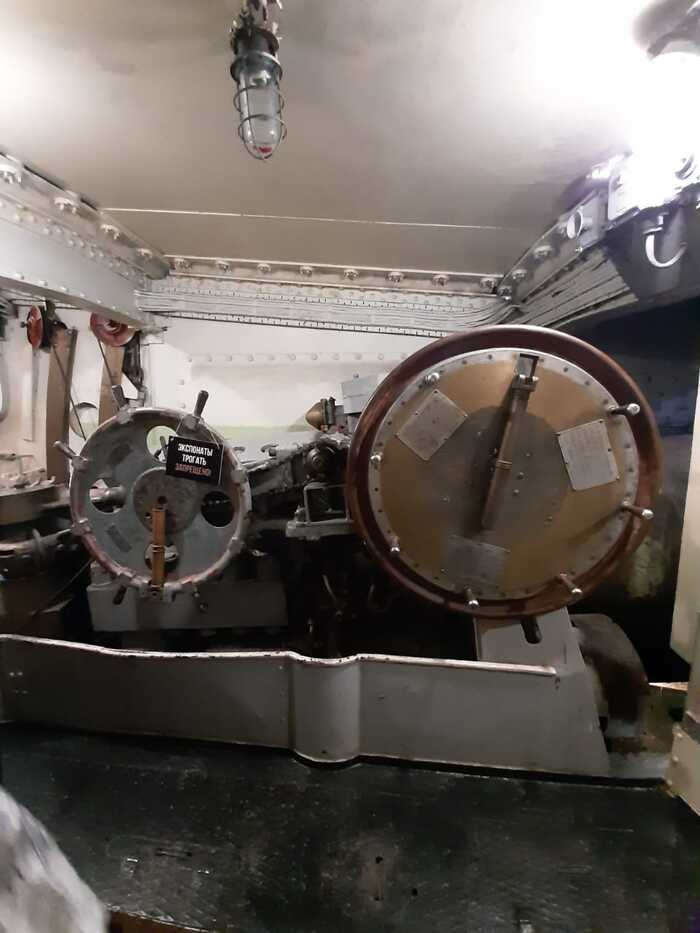 Внутри башни, все устроено ради функциональности расчета. Сама башня весит 1000 тонн. Изначально в башне находилось по 2 орудия. Которые с честью выполнили свой долг, а после реконструкции были установлены по 3 орудия, выпущенные обуховским сталелитейным заводом.