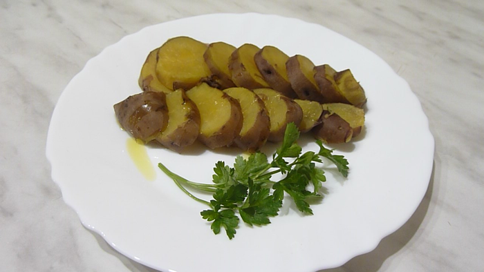 На вкус он тоже немного напоминает картофель с той разницей, что батат послаще. Не зря его называют сладким картофелем. В батате чуть больше калорий, чем в картофеле, но и полезных веществ также значительно больше. А ещё вкус батата отдаленно напоминает тыкву. Я бы сказала что — это микс вкусов картофеля и тыквы. Вареный батат очень мягкий. Его можно нарезать прямо в кожуре, полить любимым маслом, либо подать с каким-либо соусом в виде самостоятельного блюда или гарнира.