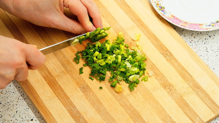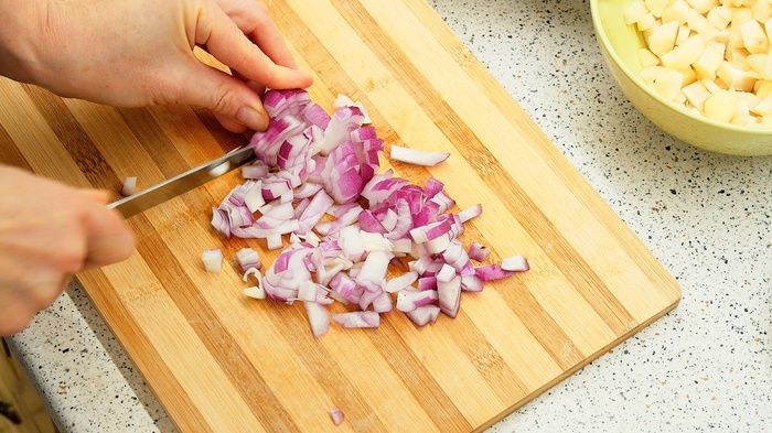 Получаются треугольники. Затем кусочки батата сложу в чашку. Посолю, добавлю пряности. У меня будут зира (кумин) и мускатный орех — по щепотке. Но можно использовать и молотую куркуму, молотый кориандр, паприку. Либо какие-то другие — по вашему вкусу и усмотрению.
