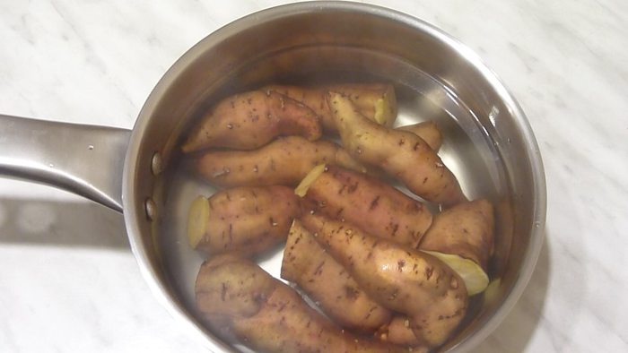 Крупные клубни разрежу пополам. Можно сразу залить горячей водой, чтобы овощи быстрее сварились. Посолю и поставлю на огонь. Вода закипает. Я убавлю огонь и буду варить батат на медленном огне. Через 20 минут проверю на готовность. Это можно сделать вилкой или зубочисткой. Он очень мягкий и он готов. Я выключаю огонь и сливаю воду. По запаху очень напоминает вареный в мундире картофель.