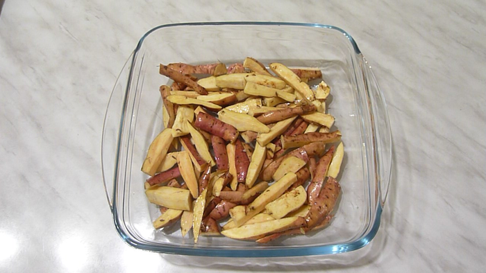 Духовка у меня уже прогрелась. Накрою форму фольгой и отправлю батат запекаться. Потребовалось около 40 минут на то, чтобы батат пропекся и стал мягким. Запеченный батат мне очень понравился. Хочется сказать, что пряности ему к лицу. Вкус становится более сложным, богатым и интересным. Рекомендую попробовать! Батат сейчас появляется в продаже. Его не обязательно выращивать. Можно просто купить. Приятного вам аппетита!