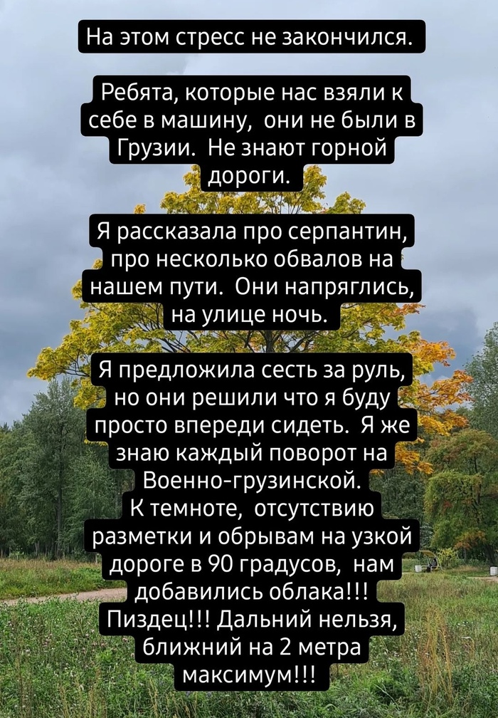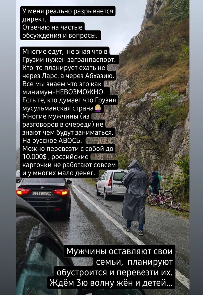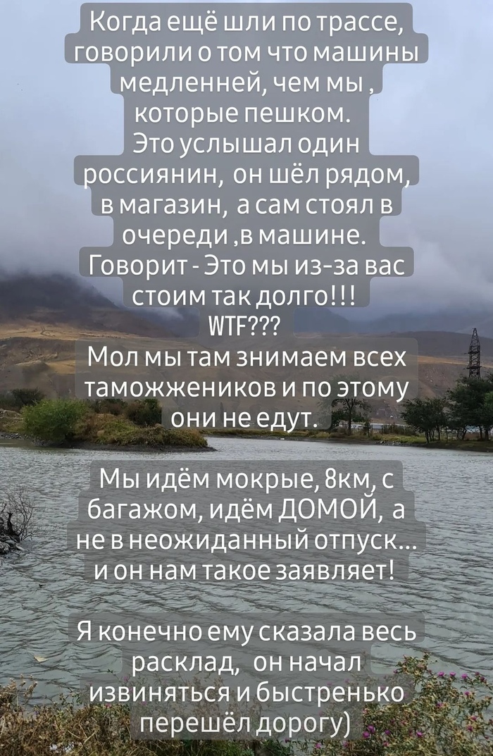 Итак. Это скриншоты из инста сторис моей тбилисской подруги (публикую с её разрешения, пруф в конце и в комментариях). Она больше 7 лет живёт в Грузии, замужем за грузином, у неё есть ВНЖ, совместная недвижимость, а также работа в туризме и на удаленке. Впервые за 3 года она решила с мужем съездить в Россию к их родственникам. Отпуск планировали давно, билеты были куплены заранее. На своей машине решили не ехать, а воспользоваться самолётом из Владикавказа и трансфером до/от Владикавказа (несколько недель назад он стоил 3-4 тр). Тк обратные билеты были на субботу, попали они в ад на кпп. Далее читайте на скринах.