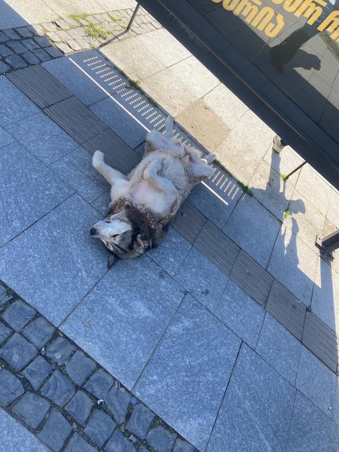 Тут одна побежала ко мне. Смазанный хвост - это она им бешено виляет, одна ест, две лежат. За стеклом остановки еще одна дрыхнет, кстати.