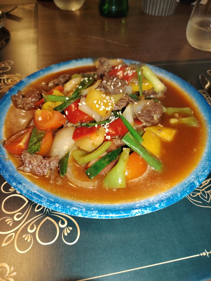 Соус кисло-сладкий, овощи хорошо приготовлены, а вот говядина слегка жестковата. В общем, Саше понравилось, но второй раз заказывать он бы это не стал.