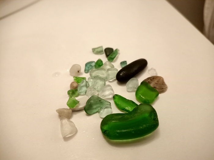 Немного покопавшись на пляже раздобыл горсточку стеклянных камешков, мусор из стекла обточенный морскими волнами.