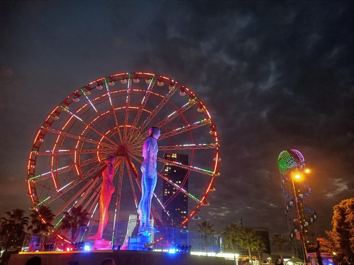 В Батуми приехали уже когда на улице стало темно, когда к городу подъезжали показалось что тут прям какой то карнавал происходит. Всё светился разными огоньками, все здания в яркой подсветке. По сравнению с тем что было по дороге, проезжая рядом с тёмными посёлками и домиками рядом с шоссе в которых совсем не горел свет в окошках, была прям дикая темнотища и только тусклые фонари немного светили на дорогу. Батуми прям контрастировал с тем что было увидено немного ранее по дороге.