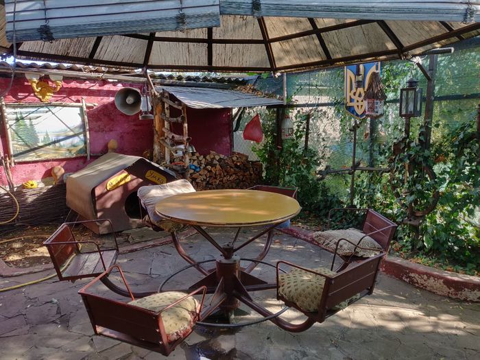 Ее забрали в гараж, механизм заварили, а сверху на круг приварили металлический лист такой же формы. Таким образом она превратилась в столик с сиденьями.