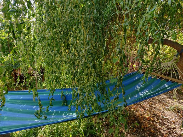 Та самая качеля, с которой все началось. Пол выложен камнем, обустроены клумбы, ну и конечно рупор. Он, кстати, не декоративный. Подключен к старенькому mp3 плееру и исправно работает.