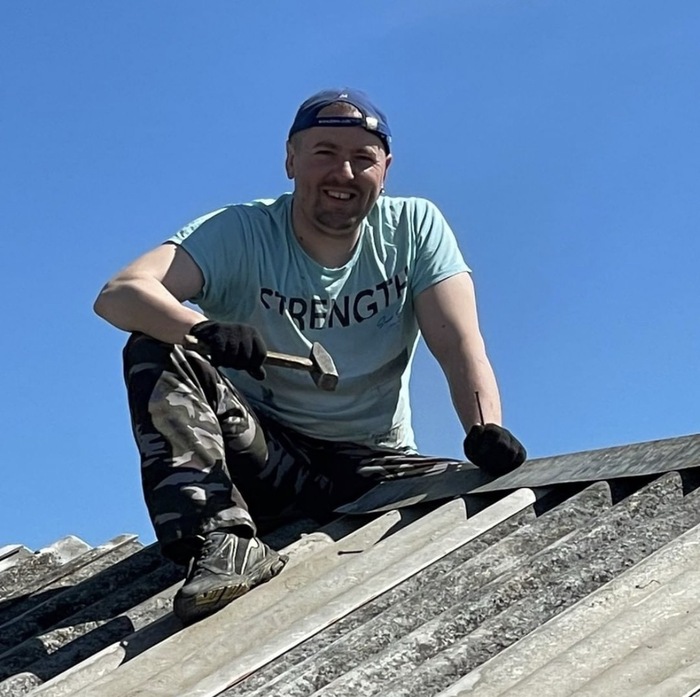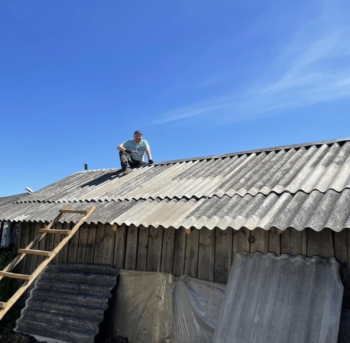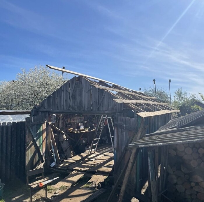 Приезжаю и смотрю, что он в одиночку далеко не в самой лучшей физической форме за это время действительно все поменял, подбил, укрепил. Оставалось только доделать обрешётку и накрыть шифером.
