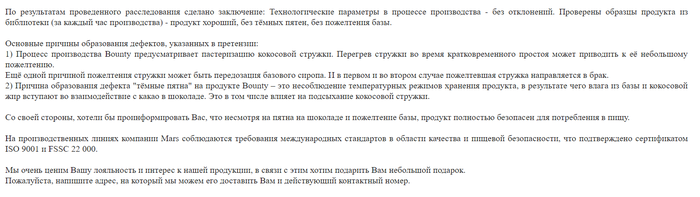 Кароче моё любимое баунти выглядело так, как будто его жёстко залихорадило. Жёлтая кокосовая стружка, чёрные пятна и на вкус как г@вно. Естественно первым делом я подумал, что надо уподобиться опыту многих пикабушников, которые добивались справедливости от производителей своими гневными письмами. Нашёл на упаковке адрес контроля качества, описал проблему, выслал письмо и благополучно забыл.