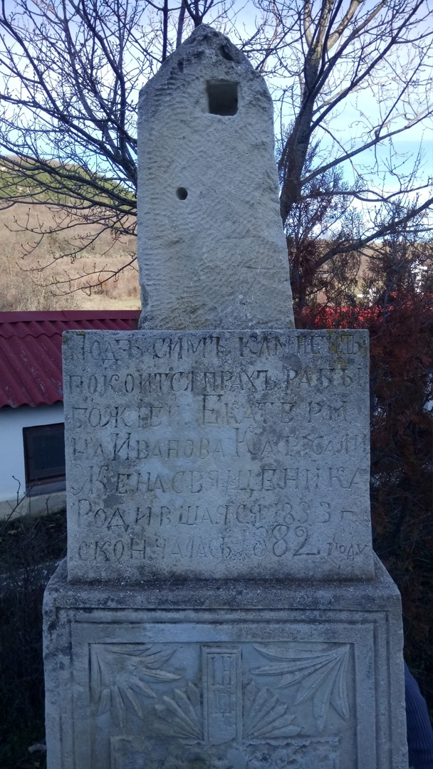 Здесь на русском языке написано, что под этим камнем упокоен прах жены священника. Фамилия указана не четко, но я предполагаю, что она тоже греческая.