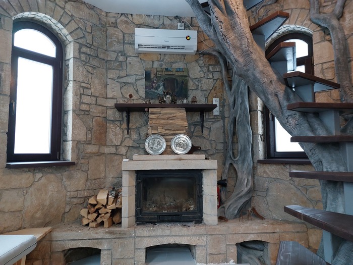 Получился настоящий трёхэтажный замок, в котором себя чувствуешь полноправным владельцем. На первом этаже - столик, небольшая кухня, где есть всё необходимое, прихожая, и рисунки на стенах, внезапно созвучные моим собственным. На втором - камин с интересными фигурками, уютные диванчики и столик, и зеркало, которому 200 лет! На третьем - большая кровать, рядом с нею красивая ванна, и ванная комната с винтажными кранами. Третий этаж посвящен теме птиц, на кровати инкрустации с птицами, лампа - птицы в клетке, шторы с изображениями птичек. Лестница сделана в виде дерева, растущего внутри башни. Подниматься/спускаться при этом удобно, перил как таковых нет, но ветви "дерева" при этом вьются так, что всегда есть за что держаться. Уезжала с надеждой уговорить друзей ещё раз выбраться туда, башня очень "зацепила", необыкновенное место!