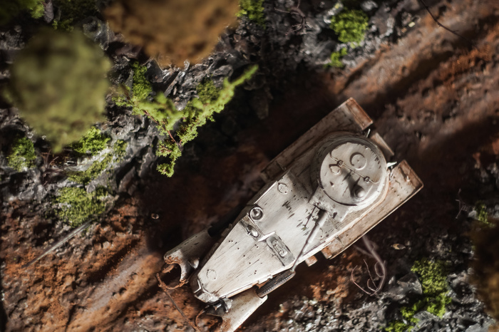Окраска корпуса - НЦ-22, темно-зеленая. Смывка масляная краска "охра", разведенная Тиккурилой-1050. Ржавчина - масляная коричневая, размыта Тиккурилой-1050.