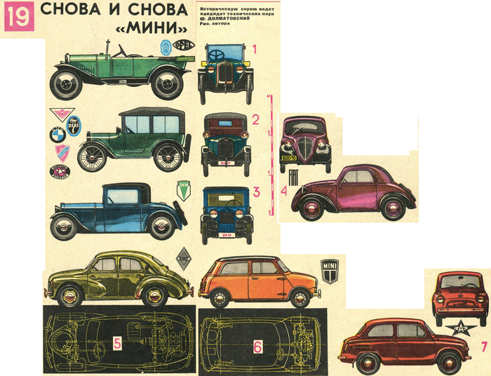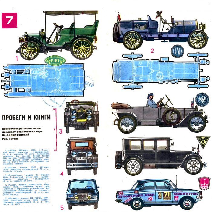 3 ряд: 1) НАМИ-1; 2) НАТИ-2; 3) КИМ-10; 4) "Москвич" 401/422; 5) "Москвич 412; 6) ВАЗ 2101 "Жигули"; 7) "Лесснер".