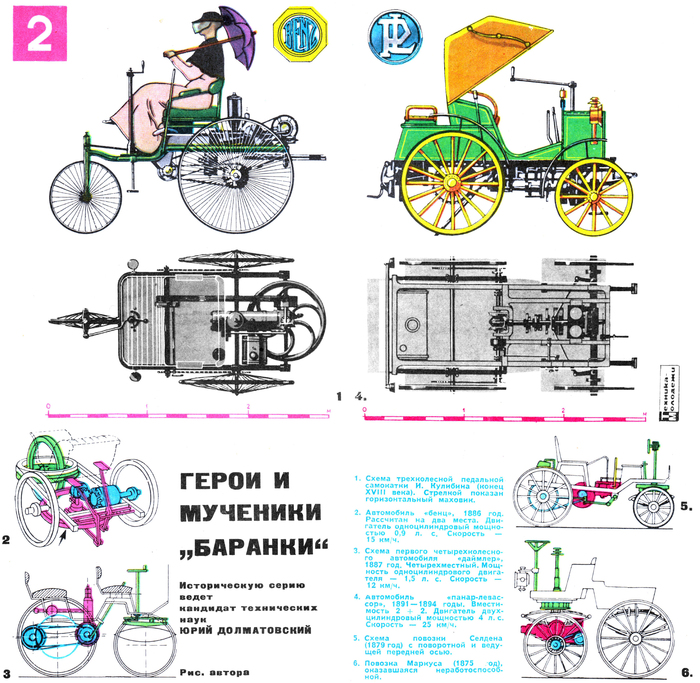 1 ряд: 1) электромобиль Романова; 2) БТАЗ-1; 3) ГАЗ-А ; 4) М-1; 5) "Победа"; 6) "Волга" ГАЗ-21; 7) "Волга" ГАЗ-24-02.