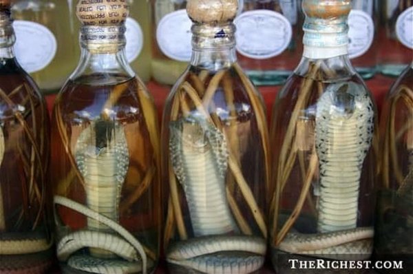 Наверняка вы видели это вино на картинках. Змеиное вино готовится путем погружения в рисовое вино ядовитых змей; это традиционный напиток для Юго-Восточной Азии, который был изобретен в Древнем Китае (первые упоминания о нем восходят к 771 году до н. э.). Это вино пьют скорее как лекарство и средство для увеличения потенции, чем как деликатес, но легально достать его очень сложно, несмотря на то, что яд змей в алкоголь не проникает.