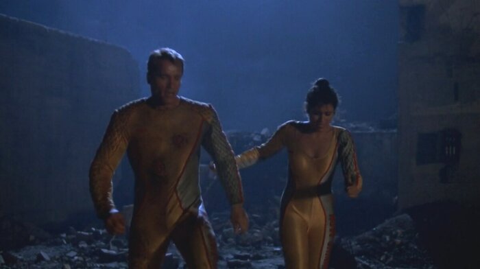 12. В попытках сделать кино более зрелищным дельцы киностудии делали всё что могли, и даже включали в картину кадры из других фильмов, права на которые им принадлежали. Например эпизод с атакующими вертолётами позаимствовали из фильма "Кинг-Конг" (1976). А эпизод со внешним видом штаба повстанцев взяли из лампового фантастического сериала "V: Последняя битва" (1984), который там тоже был центром сопротивления, правда инопланетным захватчикам похожих на ящеров, "маскирующихся под людей". Эксплуатировали также и музыку - в трейлере, рекламирующем предстоящий фантастический боевик в кинотеатрах - могучий Арни бегал по экрану под неиспользованную музыку из "Чужих" (она не звучала в фильме, но была включена в официальный саундтрек).