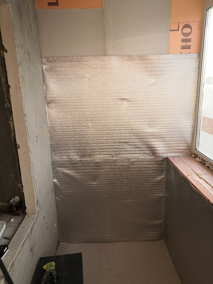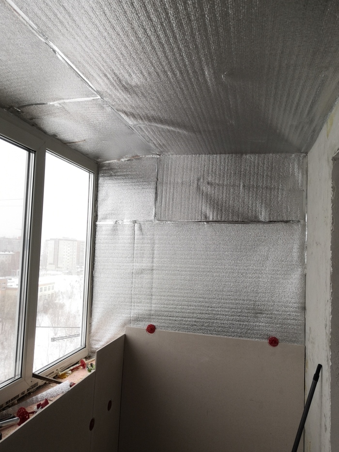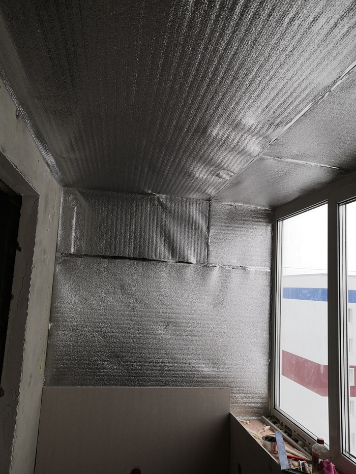Закончив с утеплением «в круг» - приступаем к пароизоляции лоджии при помощи вспененного фольгированного полиэтилена толщиной 1мм. Приклеивал его к стенам при помощи обычного 2-х стороннего скотча, и для верности в нескольких местах прибивал строительным степлером. Все стыки листов полиэтилена и места куда бились скобы степлера – изолировал металлизированным скотчем, так же этим скотчем изолировал примыкание с окном, тем самым исключая малейшую возможность попадания наружного холодного воздуха внутрь помещения.