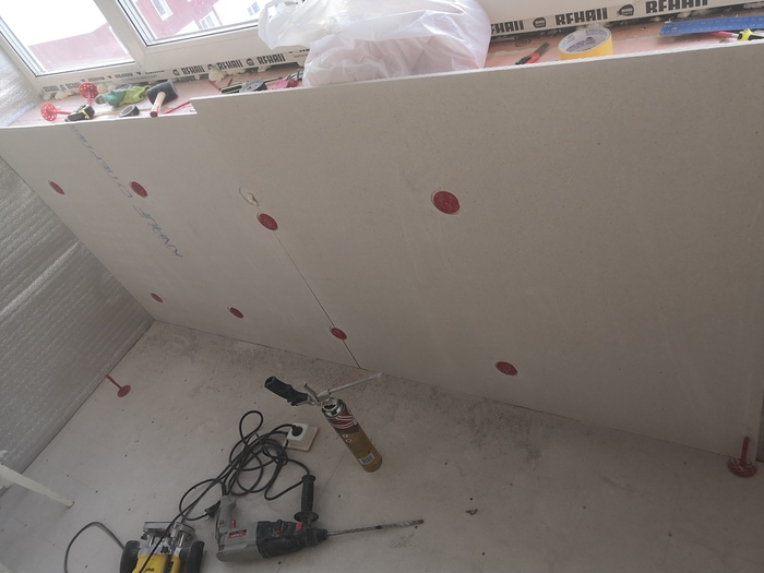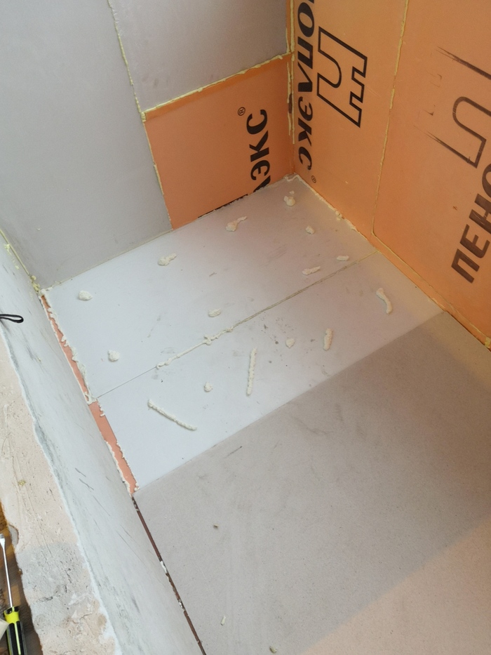 Нас уже семь человек 💪!!! Погнали дальше))) Минули Новогодние праздники и за 11 выходных дней выполнено катастрофически мало работ по доведению лоджии до «идеального» состояния, зато много выпито, еще больше съедено и пролежан ни один диван)) Праздники праздниками – а пол сам себя не сделает! При помощи монтажной пены к стяжке пола приклеен графит толщиной 50мм, все швы, естественно, так же пропенены.