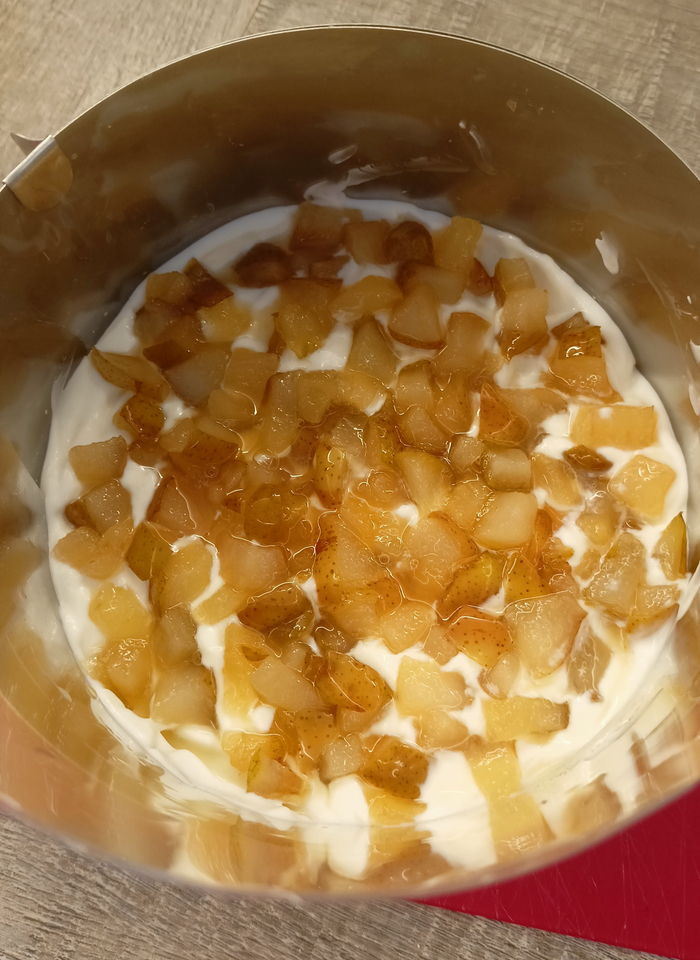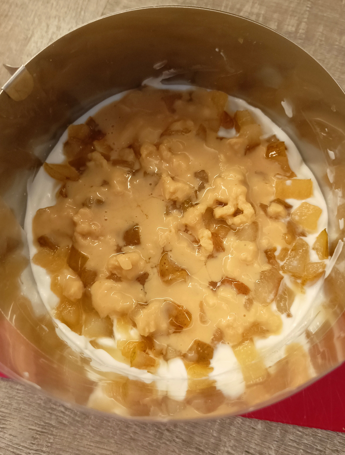 Вообще я хотела положить в торт мягкую и спелую свежую грушу. Но как назло, ни в одном магазине в округе не оказалось мягких груш. А нарушать текстуру жёсткой грушей не хотелось.