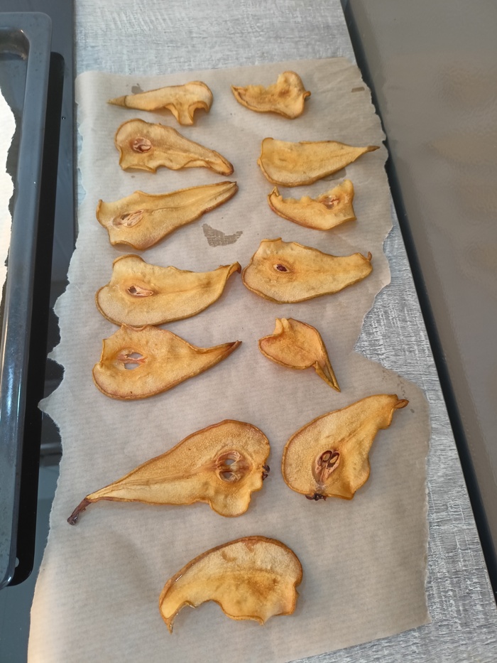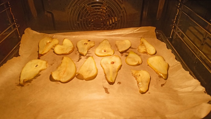 Когда вся груша сварена, выкладываю слайсы в один слой на противень, застеленный пергаментом. Отправляю в разогретую до 80 градусов духовку на 2 часа. Раз в полчаса переворачиваю цукаты