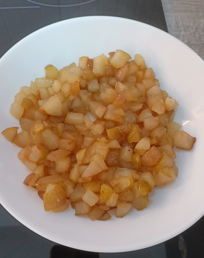 Так что я взяла 2 жесткие, но сладкие и сочные груши, нарезала из кубиком. Налила на дно сотейника немного воды (совсем чуть-чуть, просто чтобы груши не пригорели, пока не дадут сок). Варила грушу до прозрачности и мягкости, периодически помешивая, в конце выпарила всю лишнюю жидкость на сильном огне. Если груши недостаточно сочные, то возможно в процессе тушения вам наоборот придется подливать воду (все зависит от сорта груш).
