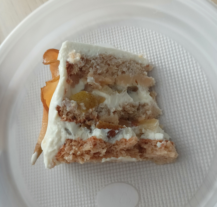 Ещё одна неожиданность: я думала, что цукаты будут только украшением, и мы не будем их есть. Когда я размещала их на торте, они были прям жёсткими, их можно было разве что грызть. Но после окончательной сборки торта он у меня простоял ещё ночь в холодильнике, и груши размягчились. В общем груши слопали быстрее, чем торт) получилось очень приятное гармоничное дополнение к торту.