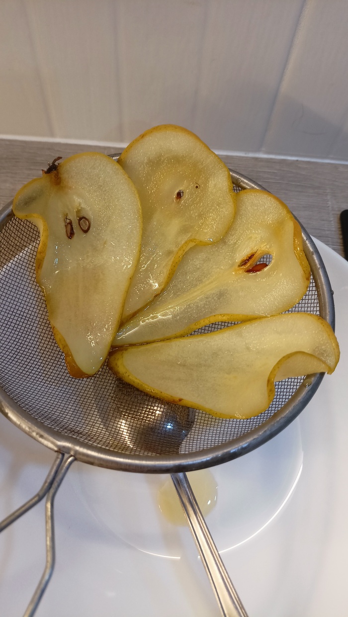 Груши нарезаем слайсами толщиной около 3мм (нам нужна самая длинная часть груши, краешки будут не такие красивые).