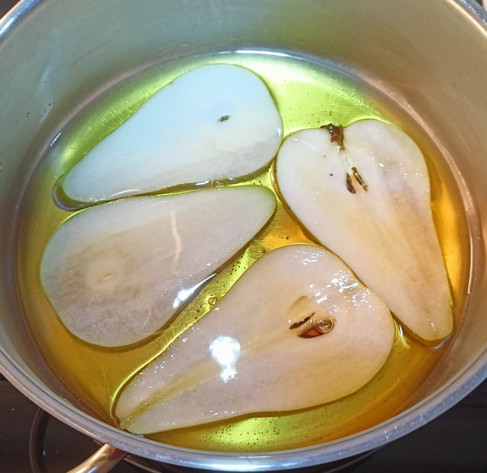 В кипящий сироп выкладываю груши (не все, порциями, чтобы каждый кусочек свободно лежал в сиропе). Провариваю каждую порцию груши около 8 минут (зависит от сорта груши, возможно сварится быстрее). Нужно, чтобы груша стала прозрачной и мягкой.