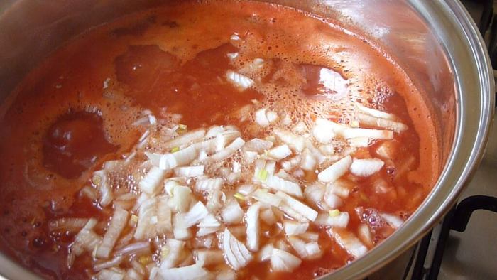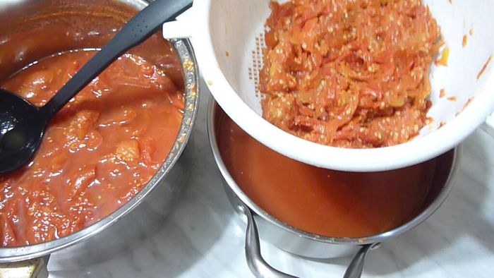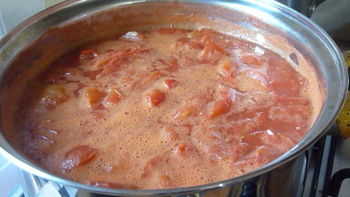 Помидоры уже хорошо прогрелась, они осели. Появилось много сока. Когда они закипят, я поварю их на медленном огне до мягкости. Обычно на это уходит от 10 до 20 минут. Время зависит от сорта помидоров и от их спелости. После этого помидоры остужаю для того, чтобы затем протереть их через сито или дуршлаг.