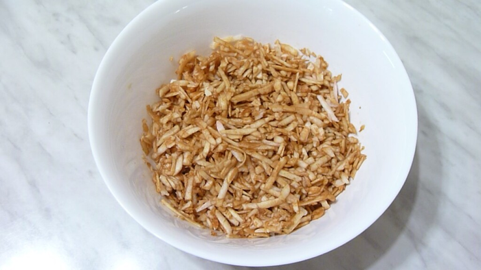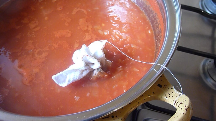 Сложу по углам марлю, сделаю мешочек и завяжу обычной ниткой. Завяжу потуже, сделаю узелок. Нитку можно брать двойную, чтобы она была покрепче. Опущу этот мешочек в кастрюлю с кетчупом. А чтобы мешочек не утонул, чтобы не ушел на дно и затем его было проще вынимать, я привязала нитку к ручке кастрюли.