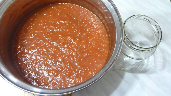 В общей сложности кетчуп у меня варился около 3 часов. Он стал густым. Чем гуще становятся кетчуп, тем чаще его нужно помешивать. По моему вкусу этой густоты уже достаточно. Поэтому я кетчуп варить больше не буду. Но вы можете решать сами. Если хотите получить более густую консистенцию, то кетчуп можно поварить и подольше.